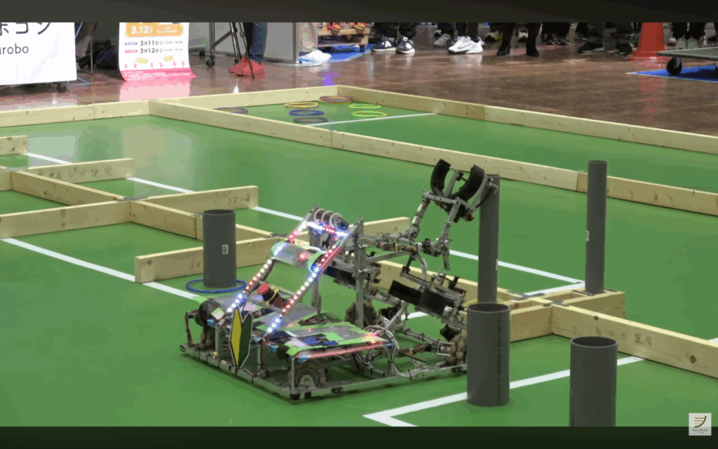 今大会の競技課題は「陣取合戦」です.陣取りゾーンに設置した櫓にリングを通して陣取りを行い,3つ以上陣取りをした状態で本丸にリングを通すと,攻略達成となりVゴールです.