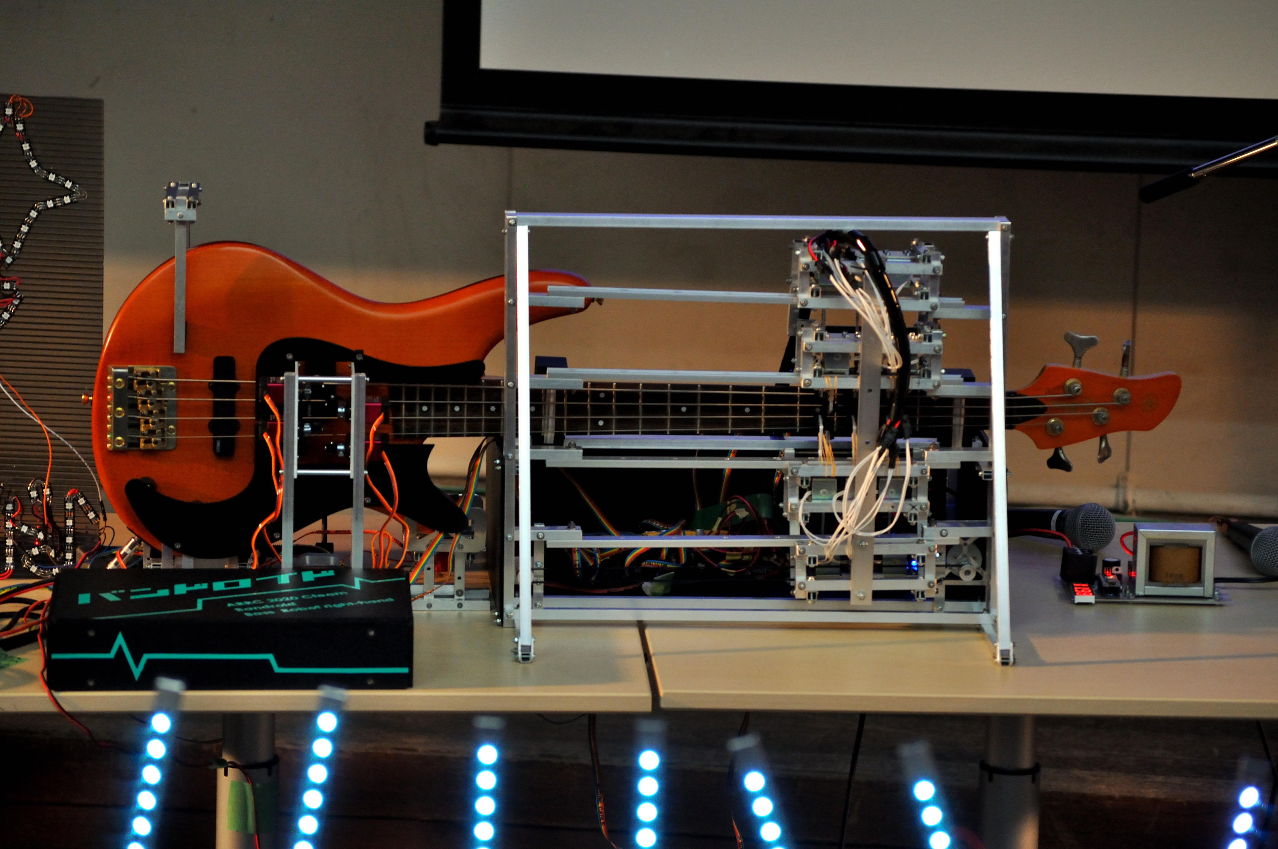 エレキギターを演奏します。サイズ制限の都合上「左手側」と「右手側」の2台で構成されています。 「左手側」は25個の指をソレノイドで動かすことで弦を押さえます。演奏する楽曲で使うコードに合わせてあらかじめ指の長さや位置を固定しています。 「右手側」は6個のサーボモータを回すことで、先端に取り付けたピックで弦を弾きます。